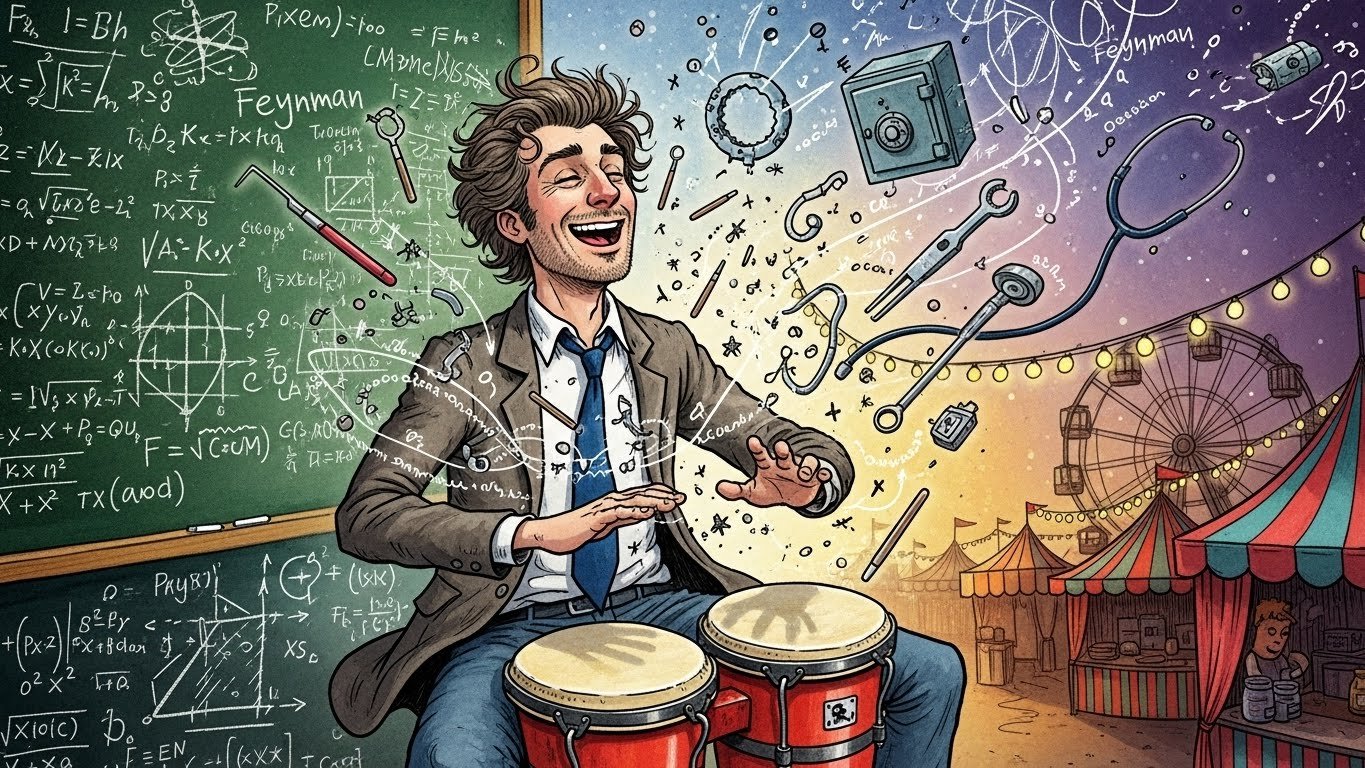 우리는 '과학자'라고 하면 근엄하고 진지한 표정으로 연구실에 박혀 있는 이미지를 떠올립니다. 하지만 리처드 파인만은 그 고정관념을 산산조각 냅니다. 그는 맨해튼 프로젝트(원자폭탄 개발)에 참여하면서 보안 금고를 심심풀이로 털어 군인들을 골탕 먹이고, 브라질에서는 삼바 축제에 참가해 신나게 봉고를 두드렸습니다.