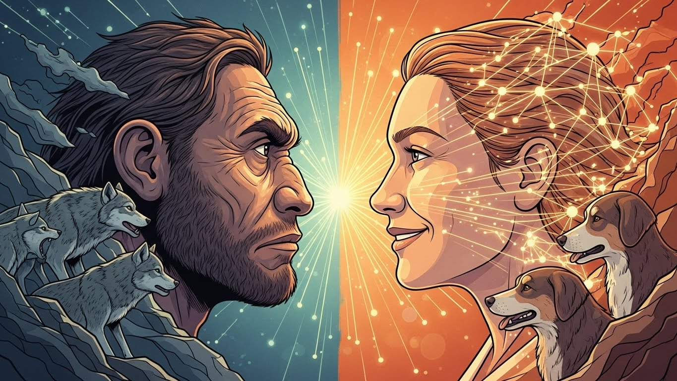 핵심 통찰: 개는 인간에게 친화력을 발휘함으로써 생존을 보장받았습니다. 공격성을 줄이고 협력하는 방향으로 진화한 것입니다. 이를 '가축화'라고 합니다. 놀랍게도 인간(호모 사피엔스) 역시 스스로를 가축화했습니다. 우리 조상 중 공격적인 개체는 도태되고, 서로 돕고 소통 잘하는 '다정한 개체'들이 살아남아 자손을 퍼뜨렸습니다. 우리의 진화는 '누가 더 세냐'가 아니라 '누가 더 잘 어울리느냐'의 싸움이었습니다.