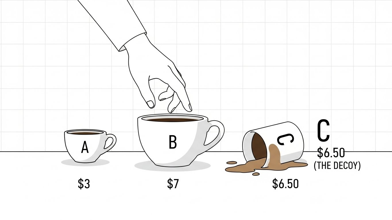 인간은 어떤 것의 가치를 절대적으로 판단하지 못합니다. 항상 '다른 것과 비교'해서 판단합니다. 마케터들은 이 본능을 이용해 '미끼 상품(Decoy)'을 던집니다.