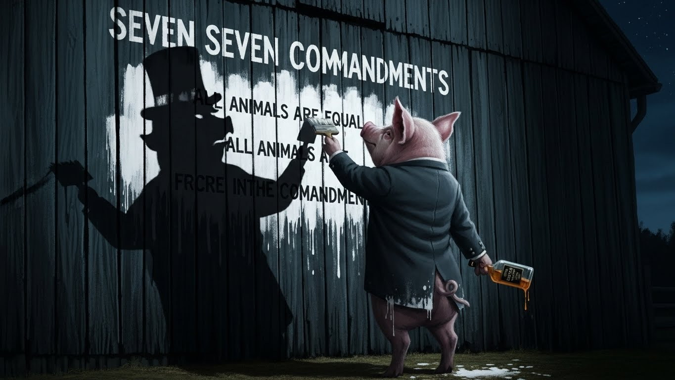 돼지들은 동물들이 글을 모른다는 점을 이용해 농장의 규칙(7계명)을 밤마다 몰래 고칩니다. "동물은 술을 마시면 안 된다" ➡️ "동물은 술을 너무 많이 마시면 안 된다" "동물은 침대에서 자면 안 된다" ➡️ "동물은 시트가 깔린 침대에서 자면 안 된다"